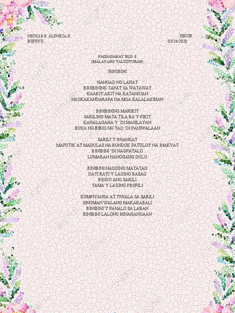 Bahagi ng pag-iral nito ay tugon sa mga estriktong estruktural na batas sa panulaan katulad ng sesura o saglit na hinto sa bawat taludtod bilang ng pantig tugmaan at iba pa. Malayang taludturan ng Tula 2. Sumulat ng isang malayang taludturan na tula na may apat na saknong at tugmang sa katinig.