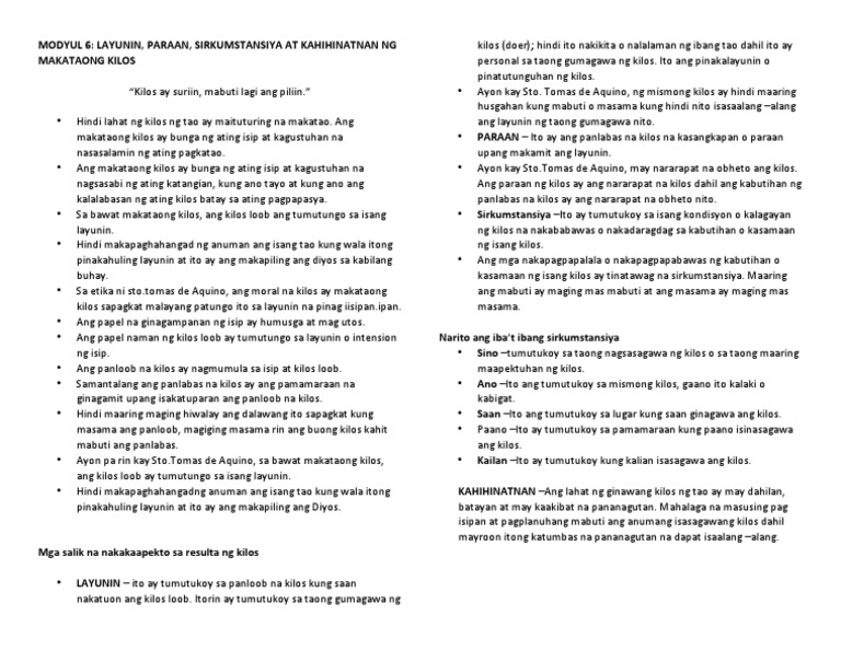 Ano ang batayan/katangian ng isang makataong pagkilos. Tukuyin ang nais sabihin ng may-akda. Nagiging batayan ng bigat ng pagkilos. Mapanuri sa mga bagay na nakikita at nararanasan-sinusuri kung paano ito makaaapekto sa buhay sa sarili at sa kapwa-naghahanap ng ibang paraan sa paglutas sa problema - pinaninindigan ang mga tamang desisyon at makataong pagkilos-hindi nagpapatalo sa mga mali - sinusuri ang mga nakikita sa paggamit ng Internet at social networking sites.